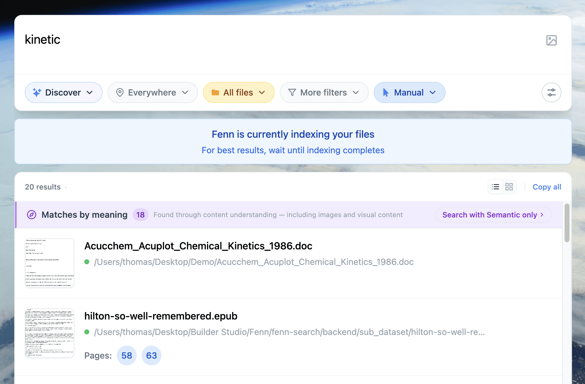 With Fenn, you search for the idea you remember, not just the filename you forgot.